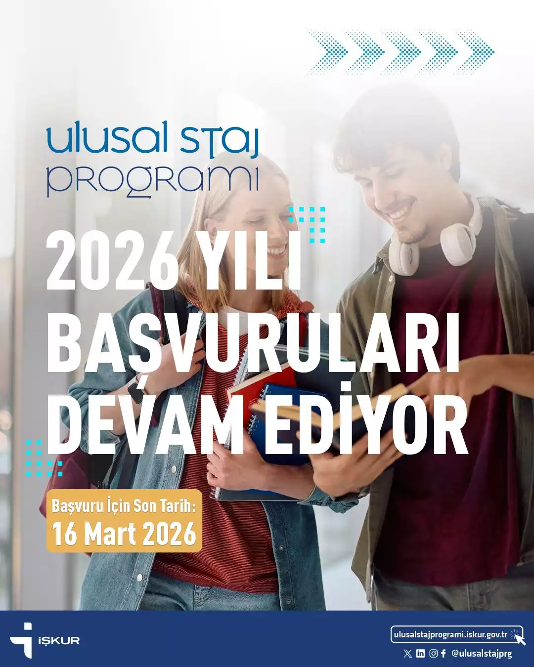 Cumhurbaşkanlığı himayelerinde, Çalışma ve Sosyal Güvenlik Bakanlığı (ÇSGB) destekleriyle ve Türkiye İş Kurumu (İŞKUR) koordinasyonunda gerçekleştirilen Ulusal Staj Programı (USP) 2026 yılı öğrenci başvuruları 06 Ocak 2025 tarihi itibarıyla başlamış olup 16 Mart 2026 tarihine kadar devam edecektir.